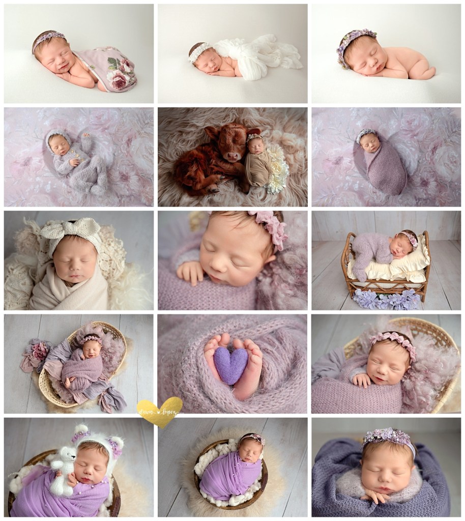Pretty in purple! A serene newborn photo shoot where the tiniest darling is swathed in soft, lavender-toned fabrics, nestled amidst delicate floral arrangements. The air is filled with the sweet scent of new baby, making the whole setting feel like a whimsical dream. Adding a touch of rustic charm, Mama desires to incorporate a sleeping highland cow into the scene. The cow’s shaggy fur and endearing expression create a heartwarming contrast to the elegance of the florals, adding a whimsical and personal touch to the precious moment. This setup not only reflects Mama’s unique style but also makes the newborn’s photo shoot an unforgettable and cherished memory.