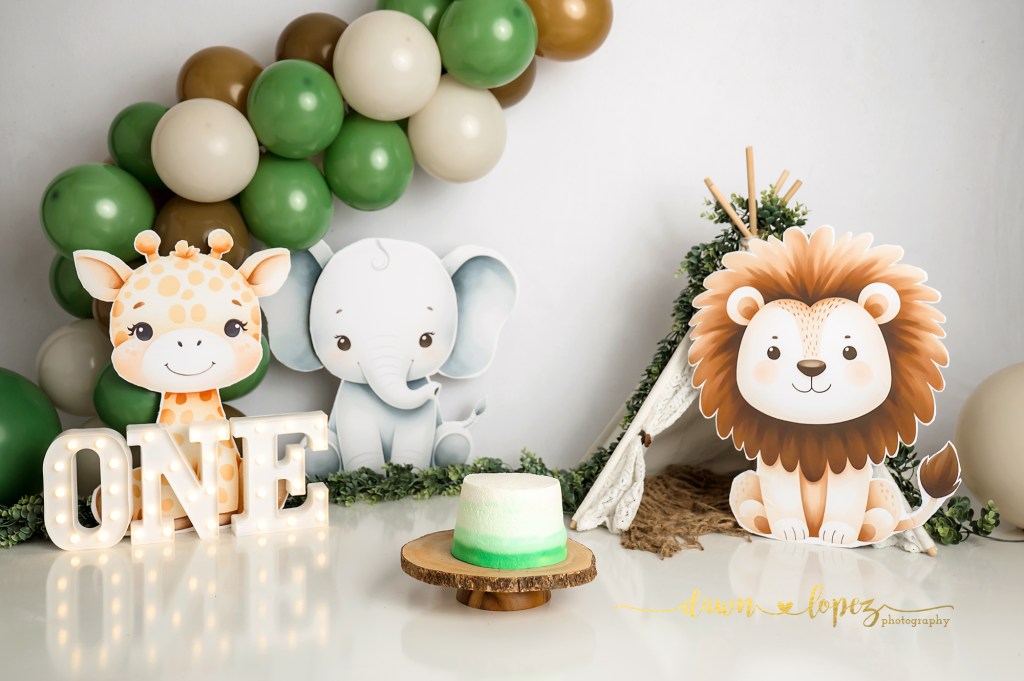 - Select Your Theme – Do you have a favorite color scheme, character, or style in mind? Let’s brainstorm and create the perfect backdrop for your child’s cake smash photos. I will decorate the backdrop, you can bring special items or additional party supplies from home if you want to. *There is an add-on charge for designing and creating special cut out props. *Add a Bath Splash for some after smash fun!